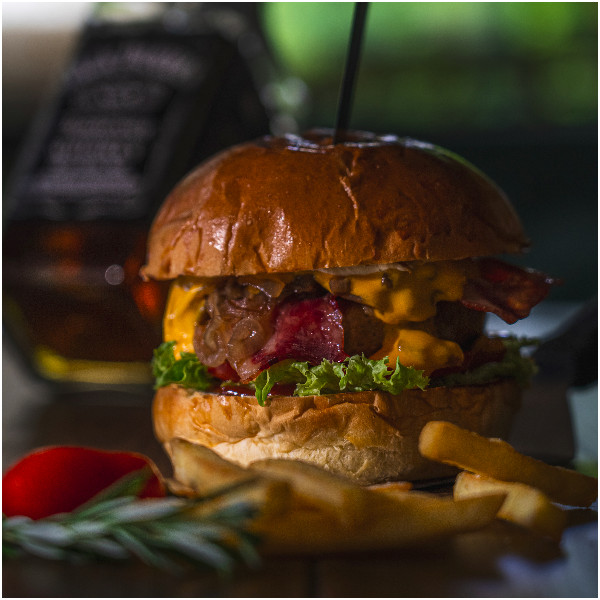 Μοσχαρίσιο μπιφτέκι, μπέικον, cheddar, καραμελωμένα κρεμμύδια, τομάτα, σάλτσα Jack Daniels & Philadelphia. Συνοδεύεται με πατάτες τηγανητές & dip Jack Daniels